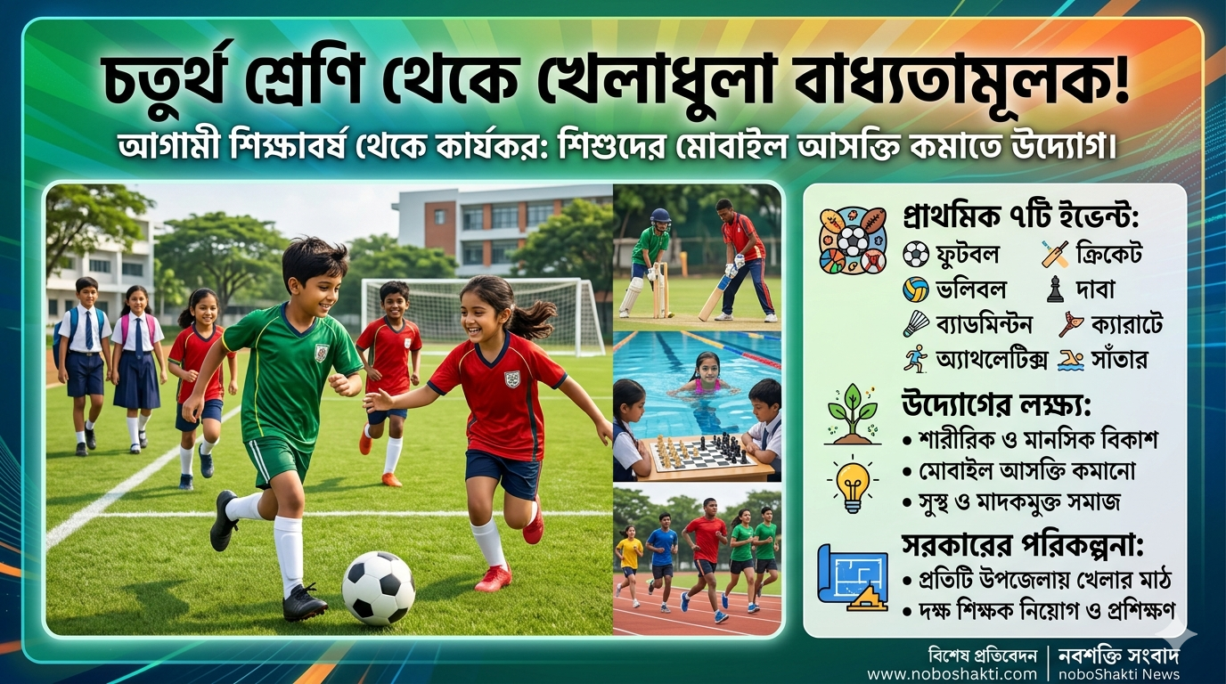 আগামী শিক্ষাবর্ষ থেকে দেশের সকল প্রাথমিক ও মাধ্যমিক বিদ্যালয়ে চতুর্থ শ্রেণি থেকে খেলাধুলা বাধ্যতামূলক করার ঘোষণা দিয়েছে সরকার। মূলত শিশুদের শারীরিক ও মানসিক বিকাশ ত্বরান্বিত করতে এবং অতিরিক্ত ডিজিটাল ডিভাইসের ওপর নির্ভরশীলতা কমিয়ে মাঠে ফিরিয়ে আনতেই এই যুগান্তকারী সিদ্ধান্ত নেওয়া হয়েছে।